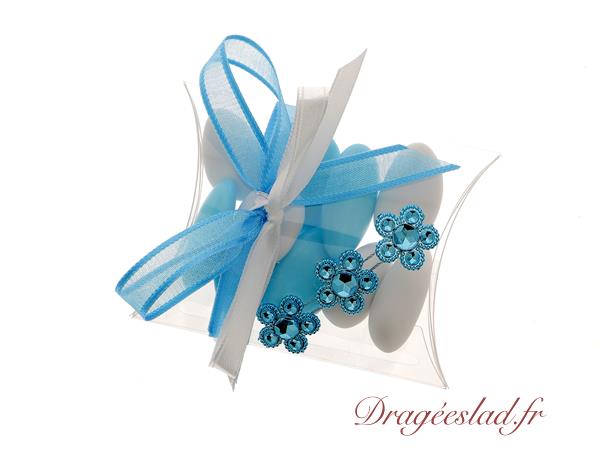 Ballotin mariage buste original décoré de fleurs turquoise. Boite à dragées garnie de dragées amande et chocolat d'un montage simple.Suggestion :Ravissante étiquette prénom autocollante en exclusivité chez Dragéeslad.
