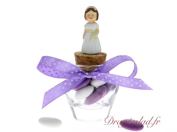 Charmant petit pot agrémenté de son ruban lilas à pois et sa toute nouvelle communiante Sacha. Contenant garni de dragées amande et chocolat. Un très joli souvenir de communion à offrir à vos invités.