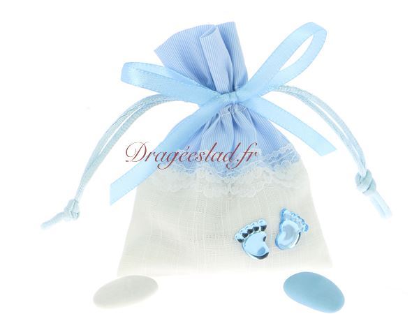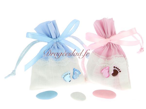 Un joli sachet en coton et dentelle pour baptême, décoré d'un ruban de satin et de 2 petits pieds. Un baptême aux couleurs douces qui ravira vos invités. Décliné en rose ou bleu au choix, le sachet est garni de  dragées amande rose ou bleu et de dragées au chocolat de couleur blanche.